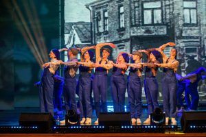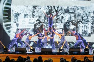 На фоновом сценическом экране мелькают кадры, словно перелистывая страницы истории, визуализируют теперь уже далекие события. Отдельный блок посвящен тысячам профсоюзных активистов, ставших в 1941-м на защиту Родины вместе со всей страной.