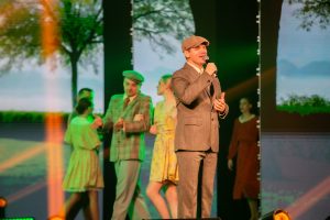 На фоновом сценическом экране мелькают кадры, словно перелистывая страницы истории, визуализируют теперь уже далекие события. Отдельный блок посвящен тысячам профсоюзных активистов, ставших в 1941-м на защиту Родины вместе со всей страной.