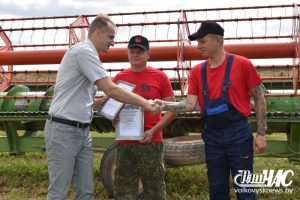 Председатель Гродненской областной организации Белорусского профсоюза работников жилищно-коммунального хозяйства и сферы обслуживания Андрей Кардаш поздравил работников с намолоченной тысячей тонн зерна. Среди награжденных оказались сотрудники КУП «Волковысское коммунальное хозяйство»: машинист-обходчик Андрей Гаврилик, водители Сергей Косило и Дмитрий Кунцевич, водители погрузчика Владимир Блажевич и Павел Ольховик. Во время уборочной кампании они трудились в КСУП «Матвеевцы», «Гнезно», «Племзавод «Россь».