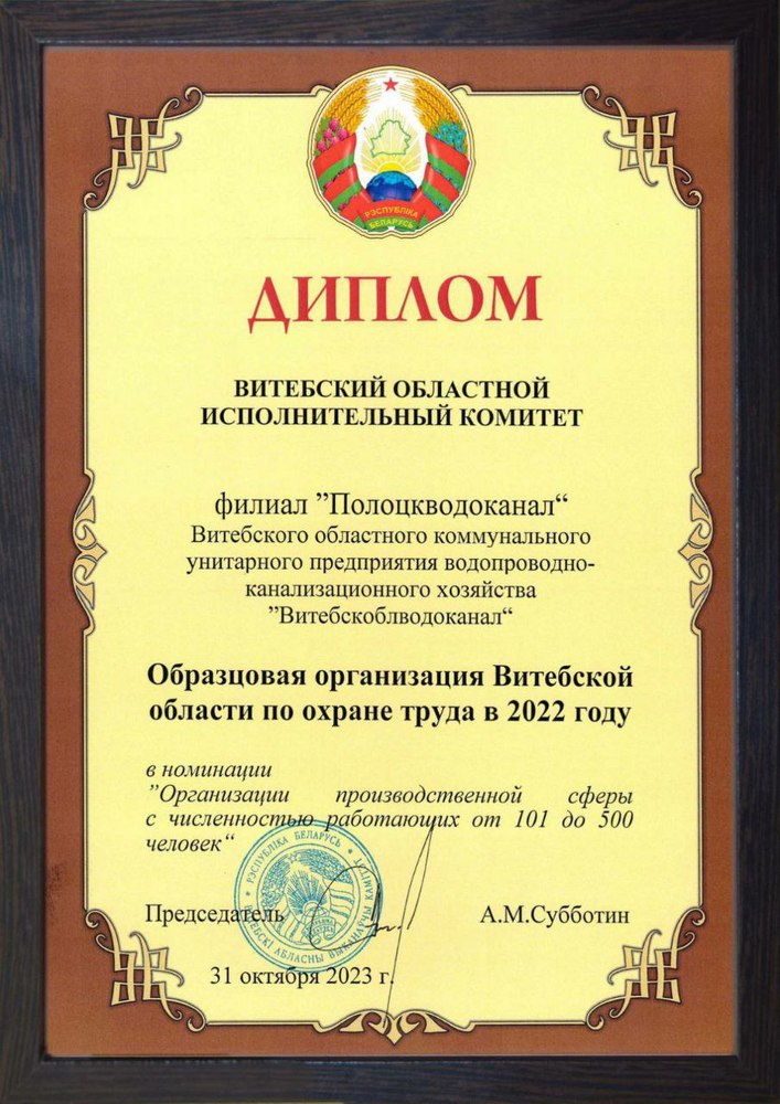В Витебском областном исполнительном комитете состоялась церемония торжественного награждения победителей ежегодного областного смотра-конкурса работы по охране труда в 2022 году. Среди предприятий производственной сферы дипломом первой степени отмечен филиал «Полоцкводоканал» УП «Витебскоблводоканал».