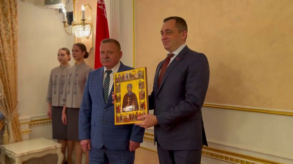 Поблагодарив за высокую оценку деятельности предприятия, Некрасов Сергей Леонидович, заместитель директора по кадрам, идеологической работе и социальным вопросам, с пожеланиями добра и душевной благодати вручил Александру Михайловичу икону Преподобной Евфросинии Полоцкой, покровительницы и заступницы земли белорусской.