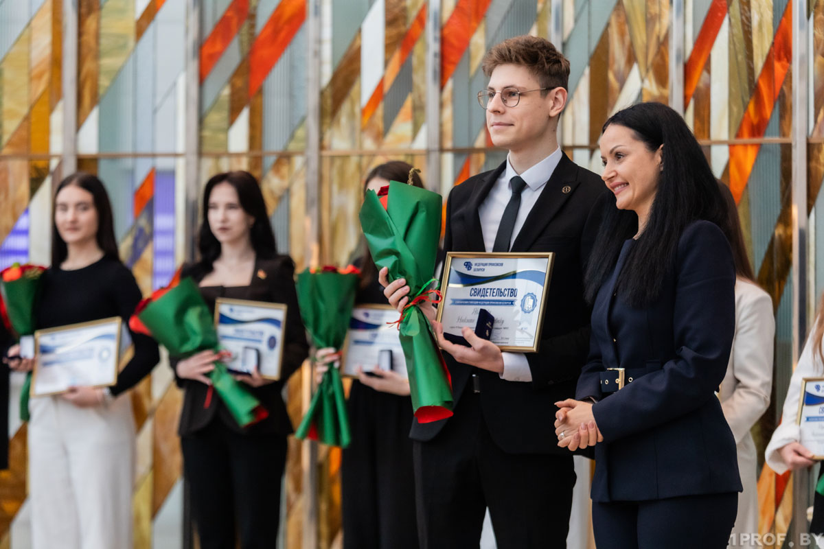 Церемония награждения стипендиатов состоялась в Зале Победы, а еще до начала официальной части виновники торжества побывали в штаб-квартире ФПБ и возложили цветы к стеле «Минск – город-герой».
