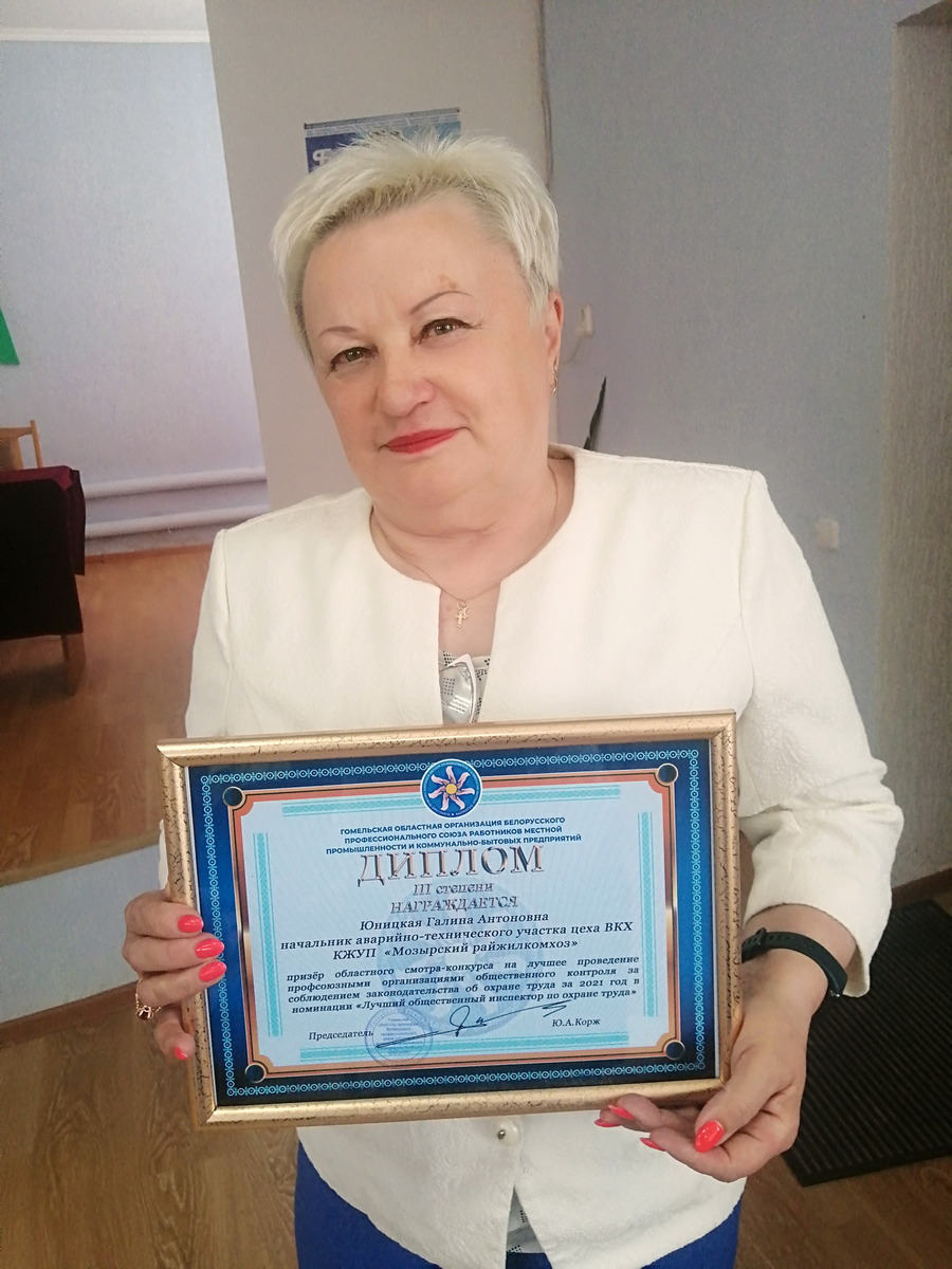 Заседание профсоюзного комитета ППО КЖУП «Мозырский райжилкомхоз» 05.05.2022г. началось с торжественного вручения Галине Юницкой, начальнику аварийно-технического участка цеха ВКХ «Диплома III степени от Гомельской областной организации Белорусского профессионального союза работников местной промышленности и коммунально-бытовых предприятий» председателем профкома Владимиром Торгони. Галина Антоновна стала призёром Гомельского областного смотра-конкурса на лучшее проведение профсоюзными организациями общественного контроля за соблюдением […]