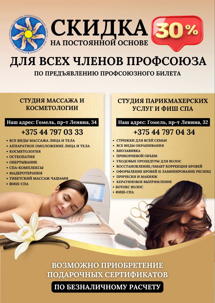 Внимание, члены профсоюза! У вас есть прекрасная возможность воспользоваться выгодным предложением от студии красоты «Ваниль» в Гомеле! Студия «Ваниль», расположенная по адресу: г. Гомель, пр-т Ленина, 32, предоставляет скидку 30% на широкий спектр услуг для всех членов профсоюза. Воспользуйтесь скидкой на: Стрижки и окрашивания: Обновите свой образ с профессиональным подходом и приятной скидкой! Биозавивки и […]