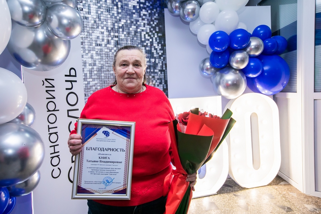 Еще четыре работника, имеющие наибольший трудовой стаж, отмечены Благодарностью Федерации профсоюзов Беларуси. Среди них – медицинская сестра санатория Надежда Тиманович, стаж работы которой – 48 лет. Она начала работать, когда на месте санатория еще размещалась школа-интернат