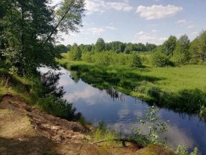 Сплав начался в чудесный солнечный июньский день от деревни Деревная, где река входит в луга, иногда сужаясь до метра и менее. Лодки с трудом вписываются в повороты, на пути следования встречается множество различных препятствий в виде мостков, кладок, завалов. По одну сторону реки раскинулся сосновый бор, кроны которого образуют тоннель, за ним тянется лес. По пути следования нас сопровождала пара лебедей. Пройдя несколько перекатов, образованных лежащими на дне реки валунами и упавшими деревьями находим уютное место с обрывом высотой 5 метров и песчаным пляжем. Это конечный пункт сплава д. Хорошевичи.